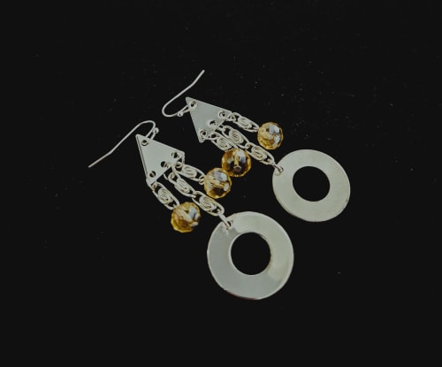 Triangle and circle shapes combined to give a geometric look , with gold crystals to add some a little bling to these super cute earrings in a silver finish.