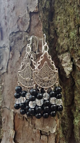 Round black Obsidian gemstone beads paired with clear crystals. Sterling Silver.